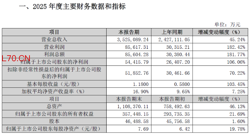 公司的财务状况同步改善。截至2025年末,总资产达到110.84亿元,较期初增长46.13%;归属于上市公司股东的所有者权益为35.74亿元,较期初增长21.69%;每股净资产为7.69元,增长19.78%。公司表示,资产与权益的增长主要系报告期内实现净利润增长所致。