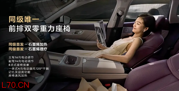 舒适性配置是深蓝S07的另一大卖点。前排标配双零重力座椅,主驾支持16向电动调节,副驾支持14向电动调节,支持120°平躺、一体式腿托和8点式按摩功能。