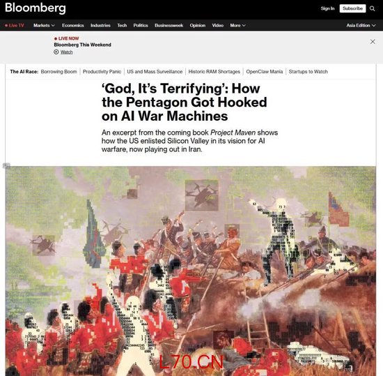 彭博社3月12日发表题为《“天啊交易系统适合自己吗,这太可怕了”:五角大楼是如何迷上AI战争机器的》的文章,讲述美国将AI技术应用于军事领域的行动。(图源:网页截图)