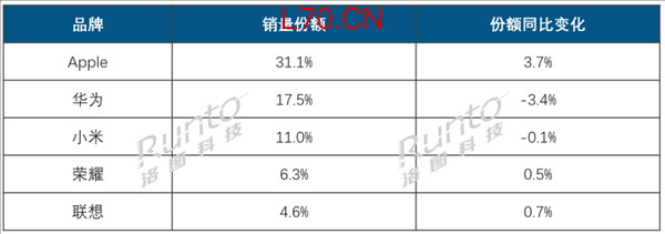 2025年全年来看,中国传统主流电商平台的销量前五名为Apple、华为、小米(含红米)、荣耀、联想,合计份额达到70.5%,同比提升了1.5个百分点。
