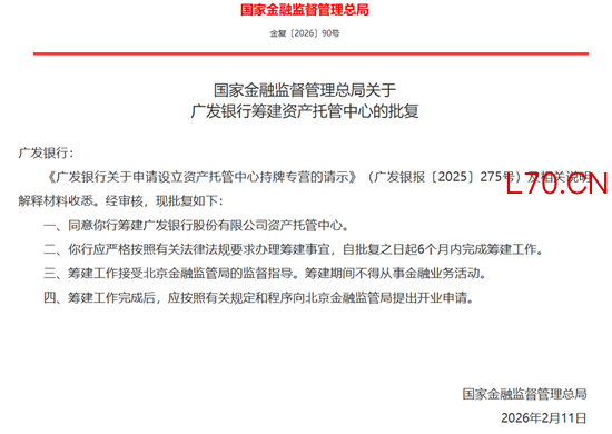 2026年2月13日,国家金融监督管理总局发布《关于广发银行筹建资产托管中心的批复》,使得广发银行成为《商业银行托管业务监督管理办法(试行)》施行后首家获批独立专营持牌资质的机构,标志着银行业托管业务迈入独立化、专业化运营的新阶段。