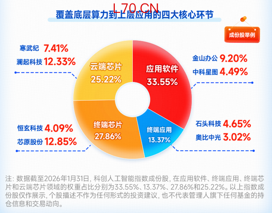 元股证券:ygzq.hk科创人工智能ETF华宝(589520)及其联接基金(联接A:024560,联接C:024561)重点布局国产AI产业链,成份股囊括国产GPU龙头(如寒武纪),国产ASIC龙头(如芯原股份)、AI应用龙头(如金山办公),半导体行业权重占比近一半,具备较强进攻性;软件行业权重占比超三成,有望受益于AI应用补涨行情。同时,该ETF是融资融券标的,是一键布局国产算力的高效工具。