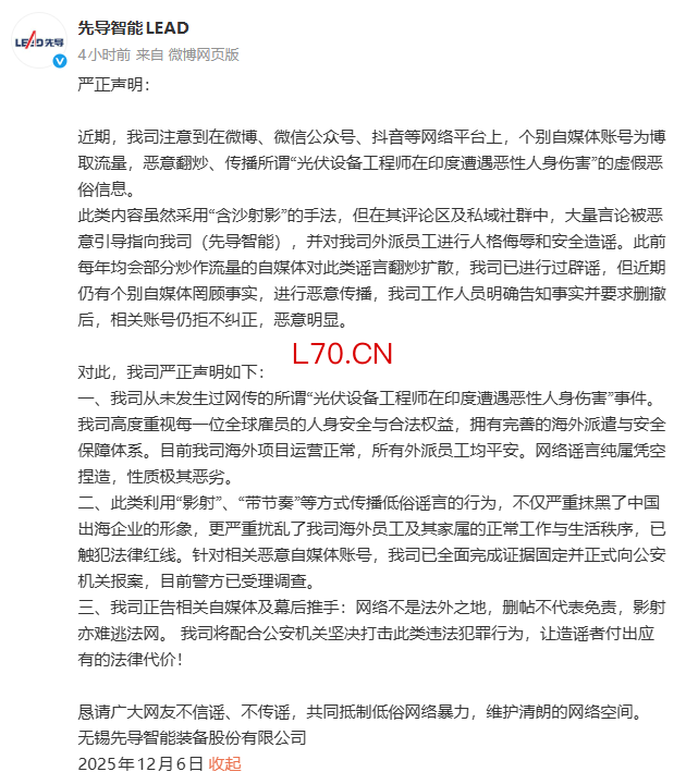 先导智能:公司从未发生过网传“光伏设备工程师在印度遭遇恶性人身伤害”事件