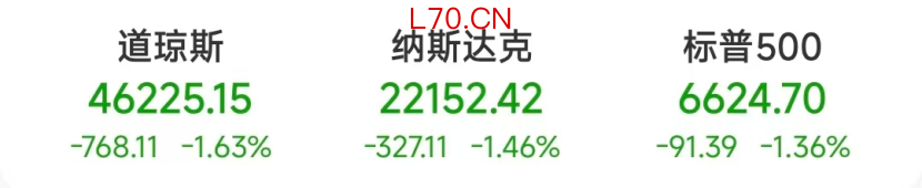 截至当天收盘,道指跌768.11点,跌幅为1.63%,报46225.15点;纳指跌327.11点,跌幅为1.46%,报22152.42点;标普500指数跌91.39点,跌幅为1.36%,报6624.70点。
