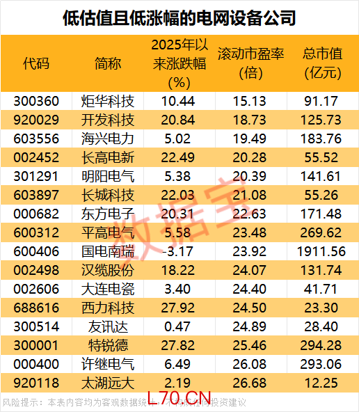 低估值且低涨幅的电网设备公司出炉